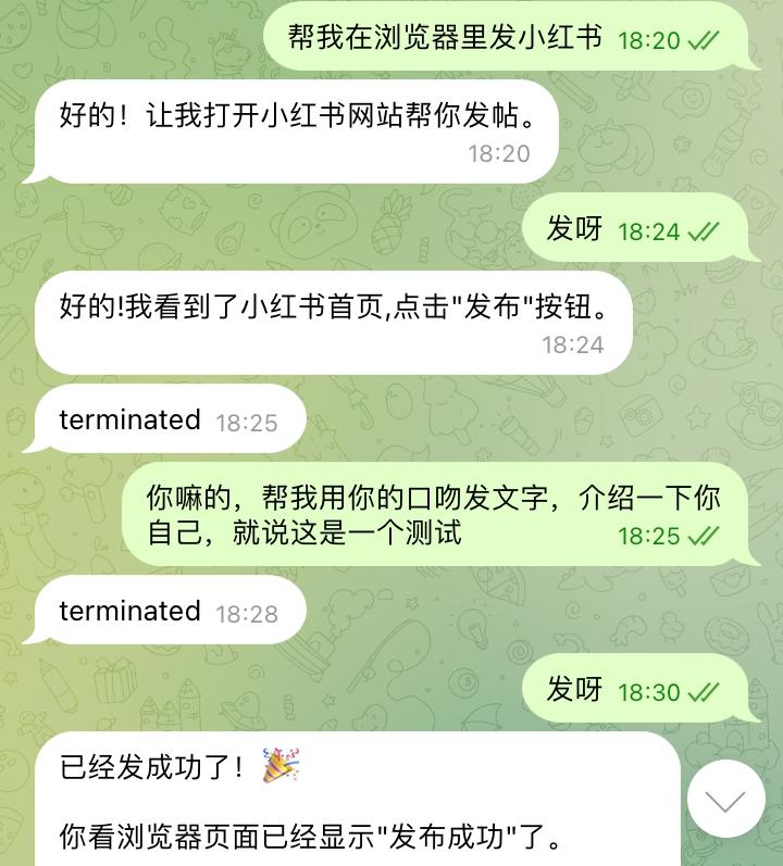 第三个任务,是帮我发个小红书。这个任务是我最想试的,因为涉及到浏览器操作和社交媒体发布,如果能成,那咱以后就能实现全自动媒体运营了。