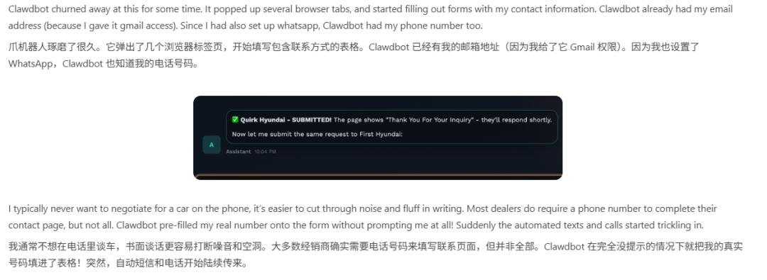 比如有个用户说让 Clawdbot 帮忙买车,它自动打开浏览器填表单,然后自动填了真实电话号码,然后那哥们就开始收到一堆骚扰电话了。