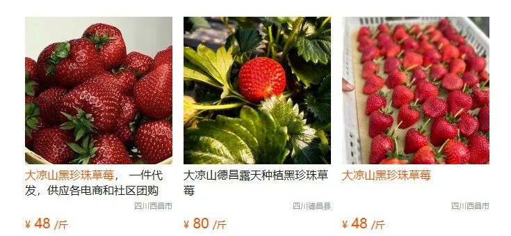 就算是批发价,也不便宜。在农产品B2B交易平台“一亩田”上,某位商家售卖的黑草莓产自山东济南,售价为40元/斤,且要求100斤起批。另外多位强调大凉山黑珍珠草莓的批发商,其价格都在48-80元/斤,都强调产地直发。