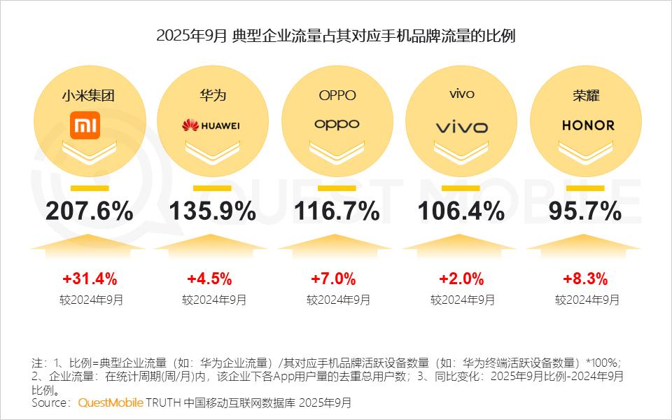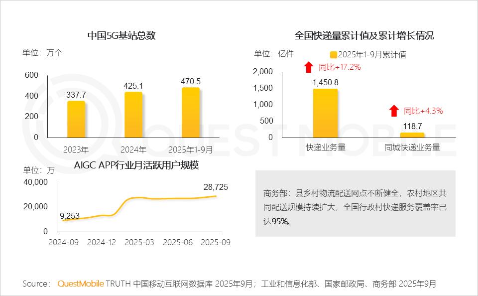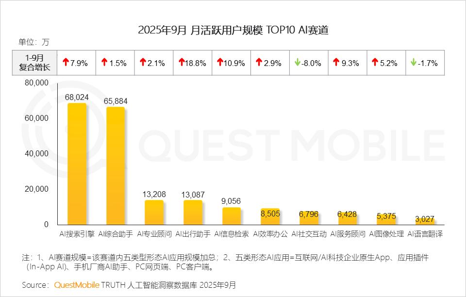 QuestMobile数据显示,2025年9月,移动端、手机厂商AI助手及PC端,用户规模分别达7.29亿、5.35亿和2.00亿。