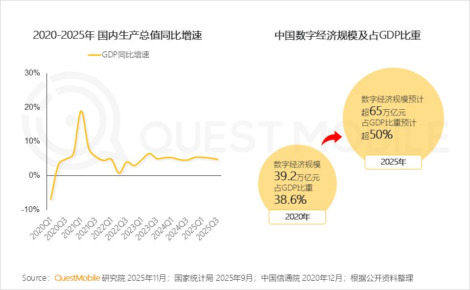 今天给大家分享一下中国移动互联网2025-2026年度核心趋势。QuestMobile数据显示,2025年是中国数字经济从“量变”转向“质变”的关键分水岭,预计全年数字经济规模将超65万亿元,占GDP比重突破50%,正式成为国民经济的核心引擎。