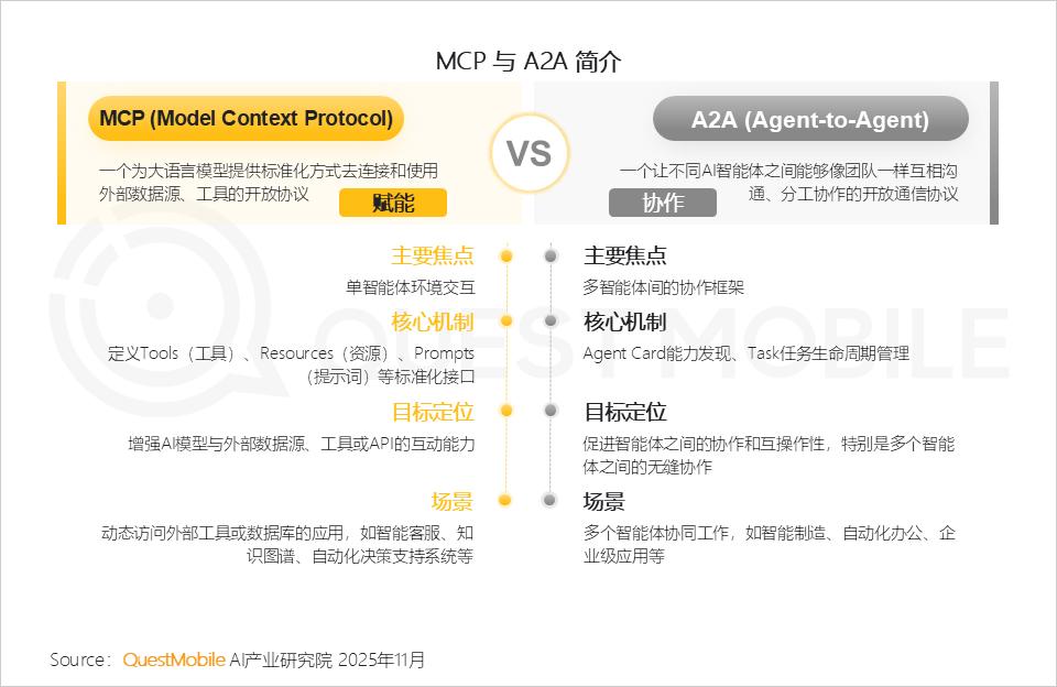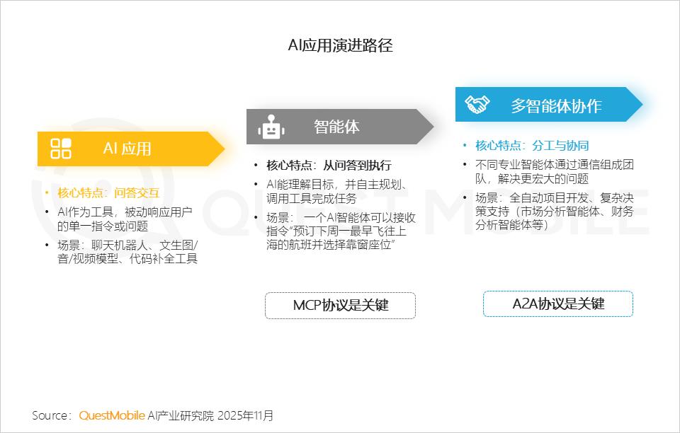 4.1 AI能力沿“工具属性”到“个体智能”再到“群体智能”进阶,核心驱动是协议层(MCP到A2A)的技术突破,以及能力维度和场景复杂度的持续升级