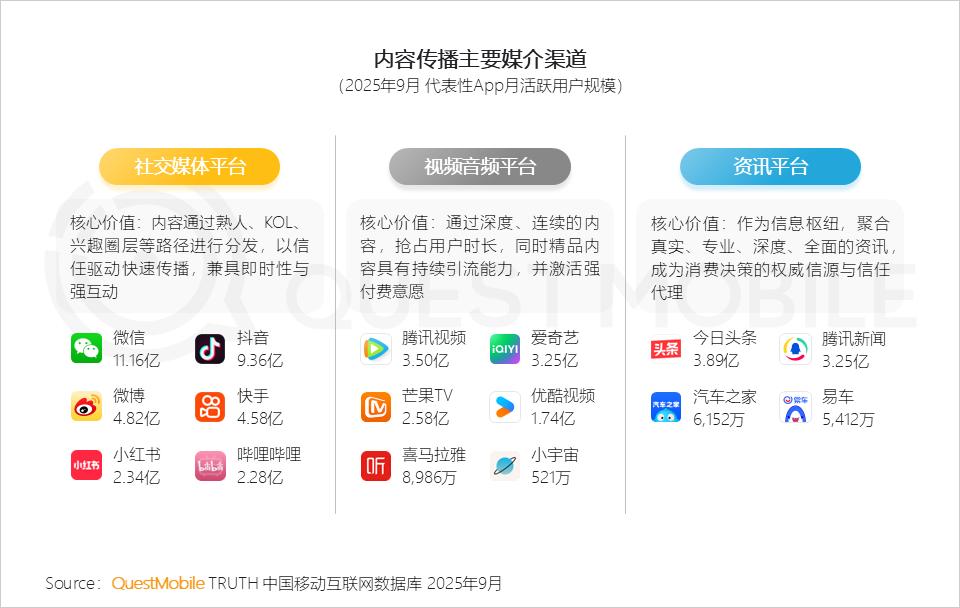3、 社交媒体、音视频及资讯平台已成为内容传播的主阵地,其差异化价值日益凸显