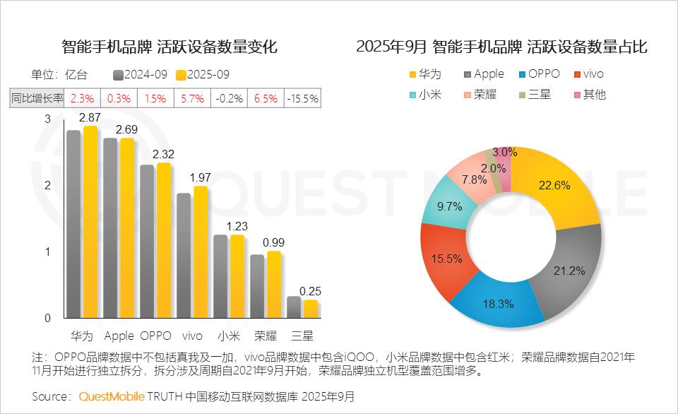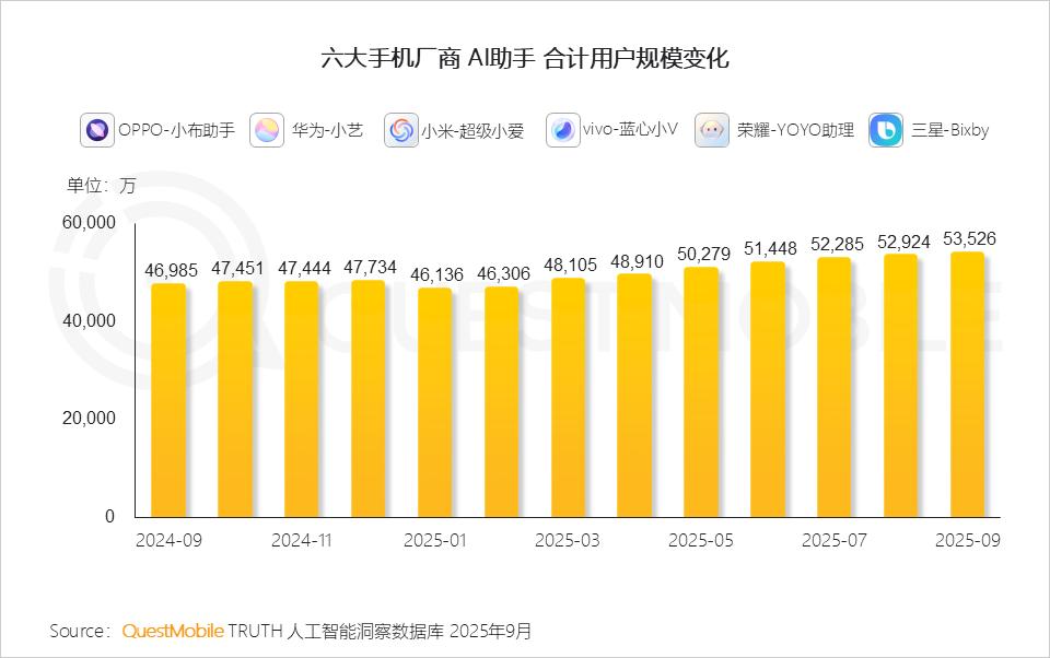 QuestMobile数据显示,自2024年9月起,一年内六大手机厂商AI助手规模合计增长6500万,同比增长13.9%。
