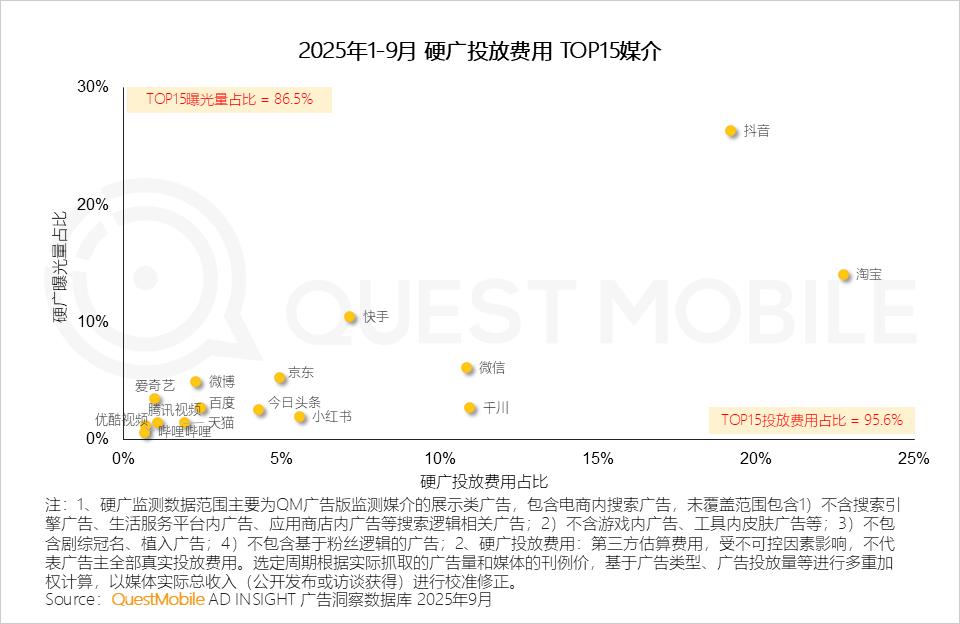 从2025年1-9月十大传统行业的线上营销结构可以看出,媒介广告根基稳固,电商广告持续强化,增幅达3.8个百分点,表明广告主对关联销售转化的营销预算倾斜。