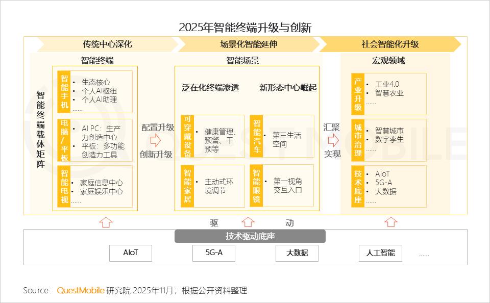 1.12025年,智能终端在新技术驱动下实现从“设备中心”到“用户中心”的范式跃迁,以传统中心深化为底座,向可穿戴设备、智能家居、智能汽车等场景化智能延伸渗透,最终推动社会迈向全面智能化升级