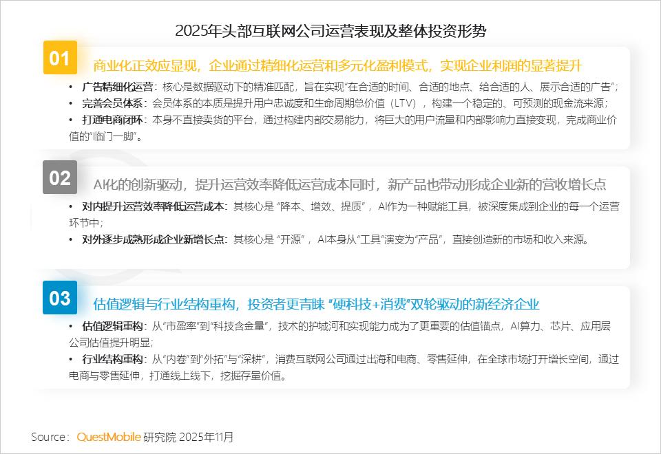 互联网平台领域表现的非常清晰。面对流量大盘见顶的现实,互联网巨头们在2025年一致选择了“降本增效”,将战略重心从“流量掠夺”、“拼抢用户规模”转向“用户价值深耕”,纷纷打破边界,尝试以“数据-技术-场景”全生态协同模式服务好用户。