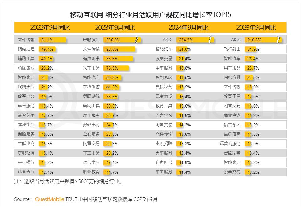 4、市场环境的改变同步影响行业流量波动,高增长行业从泛生活数字化发展向AIGC领域聚焦,同时伴随终端智能应用的快速普及