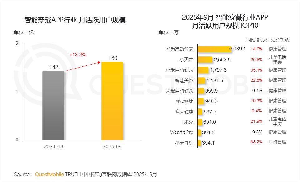 QuestMobile数据显示,2025年9月智能穿戴APP行业规模同比增长13.3%,达1.60亿,其中华为运动健康、小天才、小米运动健康APP月活跃用户规模同比增幅分别为14.6%、25.6%、35.1%,规模达到6089.1万、2563.5万、1797.8万。