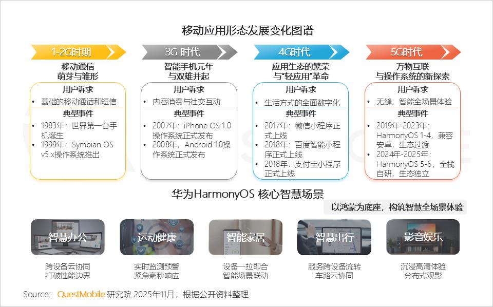 1.2 在5G、AIoT等技术逐步成熟与用户场景化需求双重驱动下,操作系统从连接“人与人”的功能平台,演进为服务“人与万物”的智慧生态,鸿蒙系统的崛起,标志进入以场景为中心的新阶段
