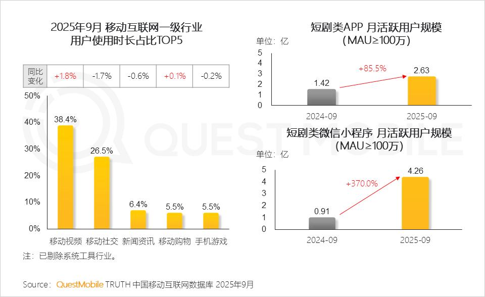 QuestMobile数据显示,截至2025年9月,移动视频以38.4%的用户使用时长占比稳居各行业之首,同比提升1.8%,反映出视频内容在吸引和维持用户注意力方面的显著优势;与此同时,短剧作为视频生态中的重要分支,呈现高速扩张趋势:百万月活规模以上的短剧类APP活跃用户达2.63亿,同比增长85.5%;短剧类微信小程序活跃用户更达到4.26亿,实现370%的同比大幅提升,显示出其强大的用户触达能力和生态渗透力。