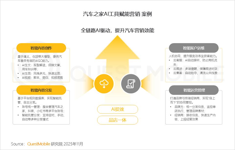 如汽车之家打造一站式AI智能营销解决方案,通过 “内容生产 - 精准分发 - 商机承接” 的全链路智能化,为汽车品牌与经销商打造一个在线高效的数字营销团队,实现高效获客。