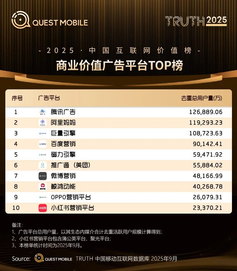 QuestMobile数据显示,2025年9月,绝大部分TOP10 PC端网页应用来自头部互联网集团,如百度、抖音、腾讯;文心助手、豆包、腾讯文档网页端用户规模分别达3,426万、2,572万和1,854万。