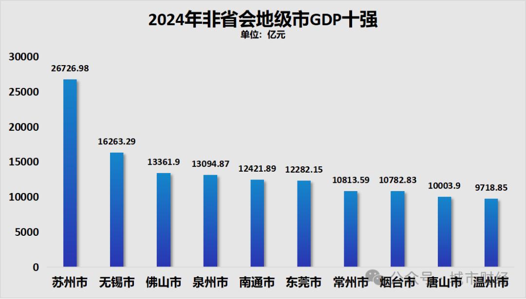 根据各城市统计局公布的2024年GDP数据,目前十强非省会地级市依次为: 苏州、无锡、佛山、泉州、南通、东莞、常州、烟台、唐山、温州。