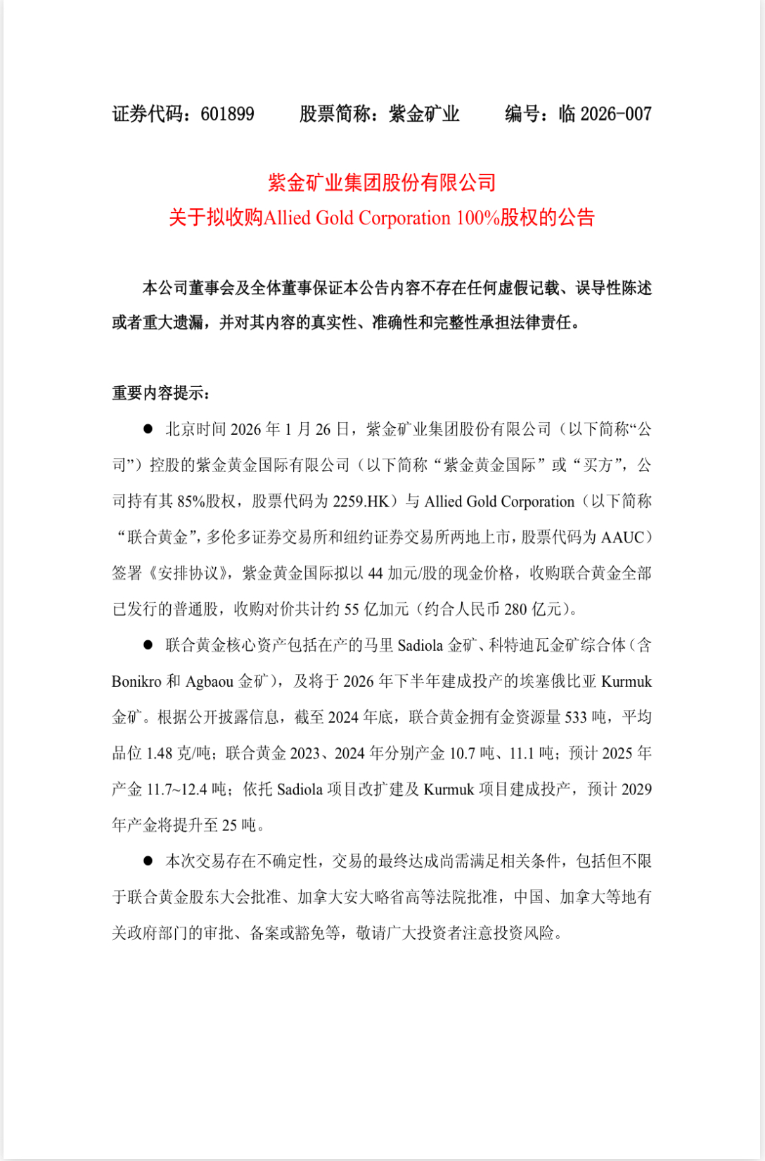 2026年1月26日,市值突破万亿的紫金矿业公告,拟通过控股子公司紫金黄金国际,以280亿元人民币现金全额收购联合黄金全部股权,将这家总部位于加拿大、核心资产散落非洲三国的金矿企业收入麾下。