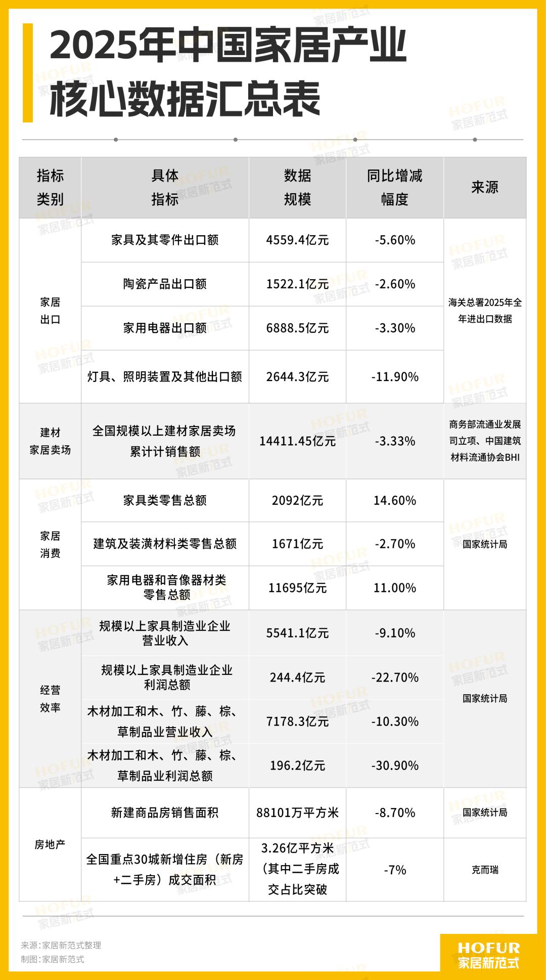 2025年中国家具、建筑陶瓷、家电、灯具的出口额分别下降5.6%、3.5%、3.3%、11.9%;全国规模以上建材家居卖场销售额下降3.33%,建材零售总额下滑2.7个百分点;经营效益方面,规上家具制造、木材加工企业的营收和利润呈现大幅双降;房地产开发投资和销售面积均双降。