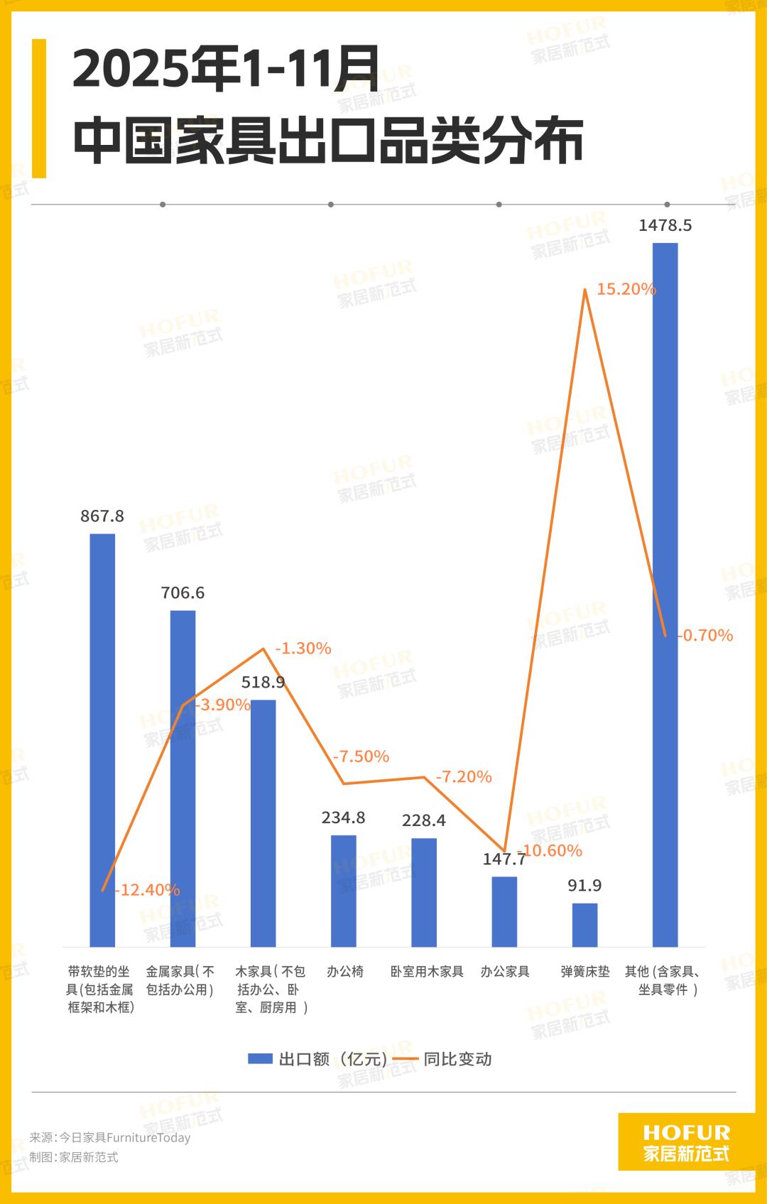 国别差异明显。根据美国全国零售联合会(NRF)等数据,波兰2025年前三季度卧室家具产量同比大幅提升39%,厨房家具也实现6%的增长;在美国市场,舒适性与实用性兼具的沙发、床垫和卧室家具备受消费者青睐。