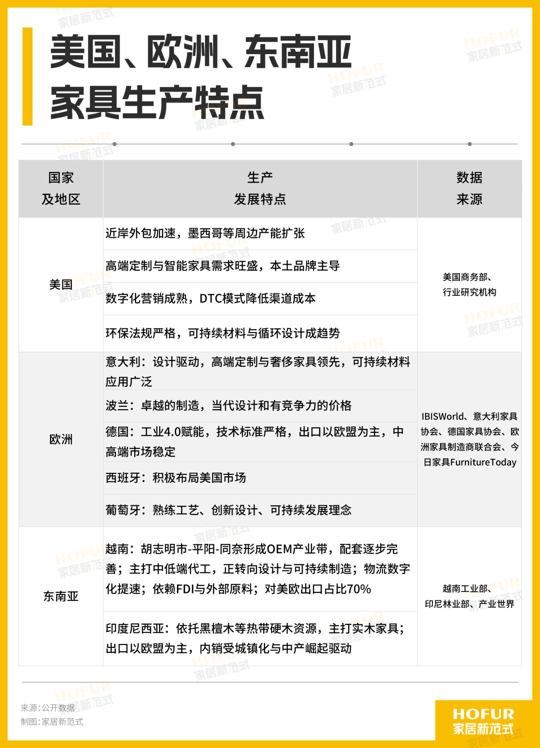 除中国外,美国、欧洲、东南亚也是全球主要的家具生产与出口中心。2025年各代表性产地的生产发展特点如下: