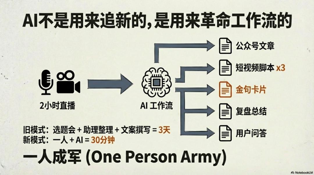 昨天我直播了两个小时,讲了很多碎片化的观点。下播后,我不需要再找个助理去听录音、整理逐字稿。我直接把回放转成文字,扔给AI,告诉它: