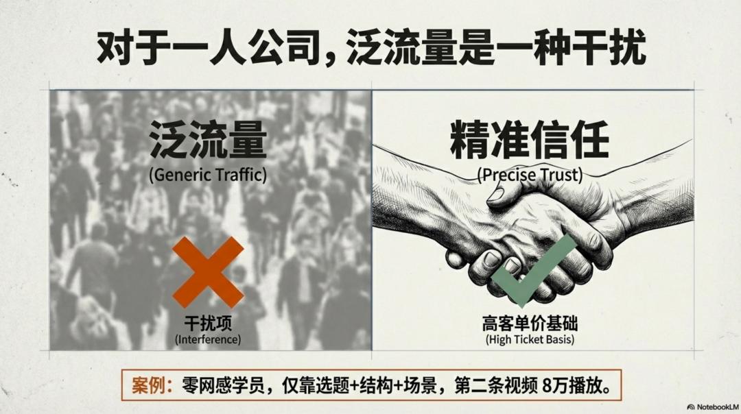为什么?因为流量不等于变现,尤其是对于我们这种做高客单价咨询或服务的一人公司来说,泛流量不仅没用,反而是一种干扰 。