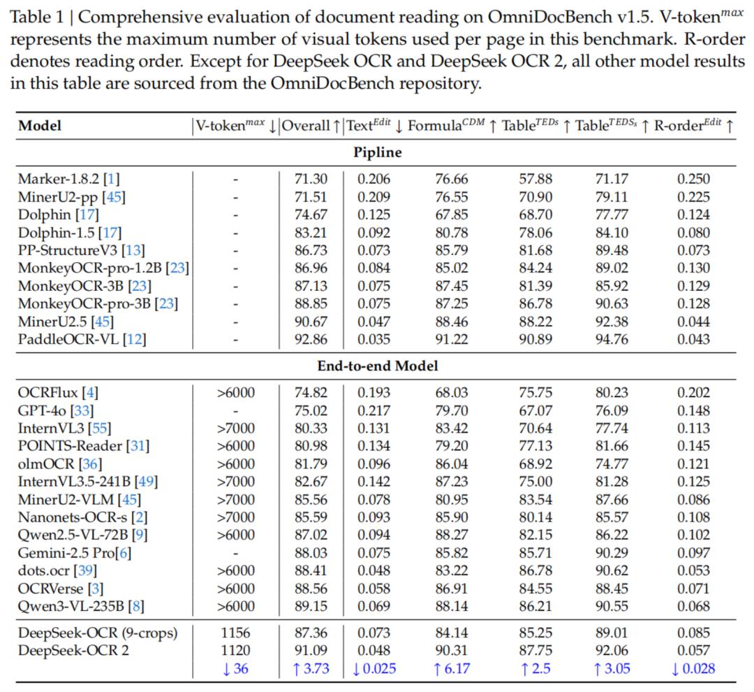 在OmniDocBench v1.5基准测试中,DeepSeek-OCR2在使用最少视觉Token(仅256-1120个)的情况下,综合得分高达91.09%,相比前代提升了3.73%。