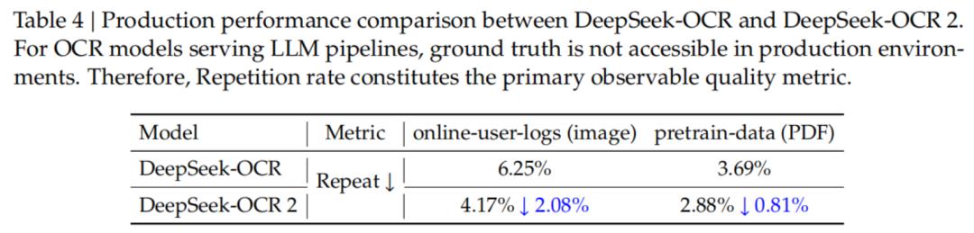 DeepSeek披露,在处理在线用户日志图像时,OCR结果的重复率从6.25%降到了4.17%;在PDF数据生产场景中,重复率从3.69%降到了2.88%。