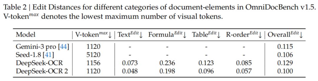 在均使用约1120个视觉Token的情况下,DeepSeek-OCR2的文档解析编辑距离(0.100)优于Gemini-3 Pro(0.115)。