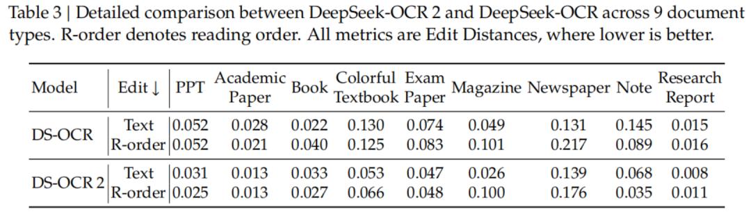 特别值得一提的是,在阅读顺序(R-order)的编辑距离(Edit Distance)指标上,DeepSeek-OCR2从前代的0.085显著降低到了0.057。