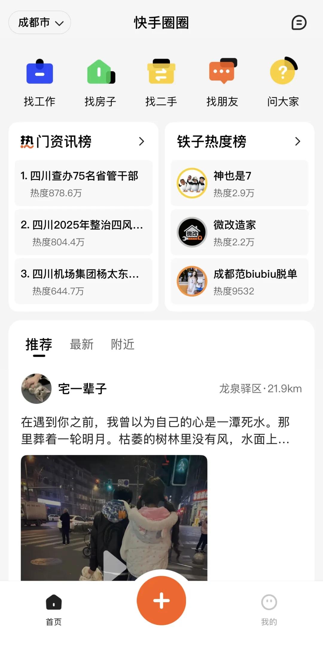 从目前APP页面上看,快手圈圈涵盖招聘、找房子、找朋友、二手交易等多元民生服务模块,面向C端的家政板块的入口暂时还未上线。其中,“找房子”包括房屋买卖装修、求租招租互助,拥有不少房源;“找二手”提供同城闲置自由换服务,类目包括家电家具、母婴用品、数码潮玩等;“找朋友”则设有本地社交板块。