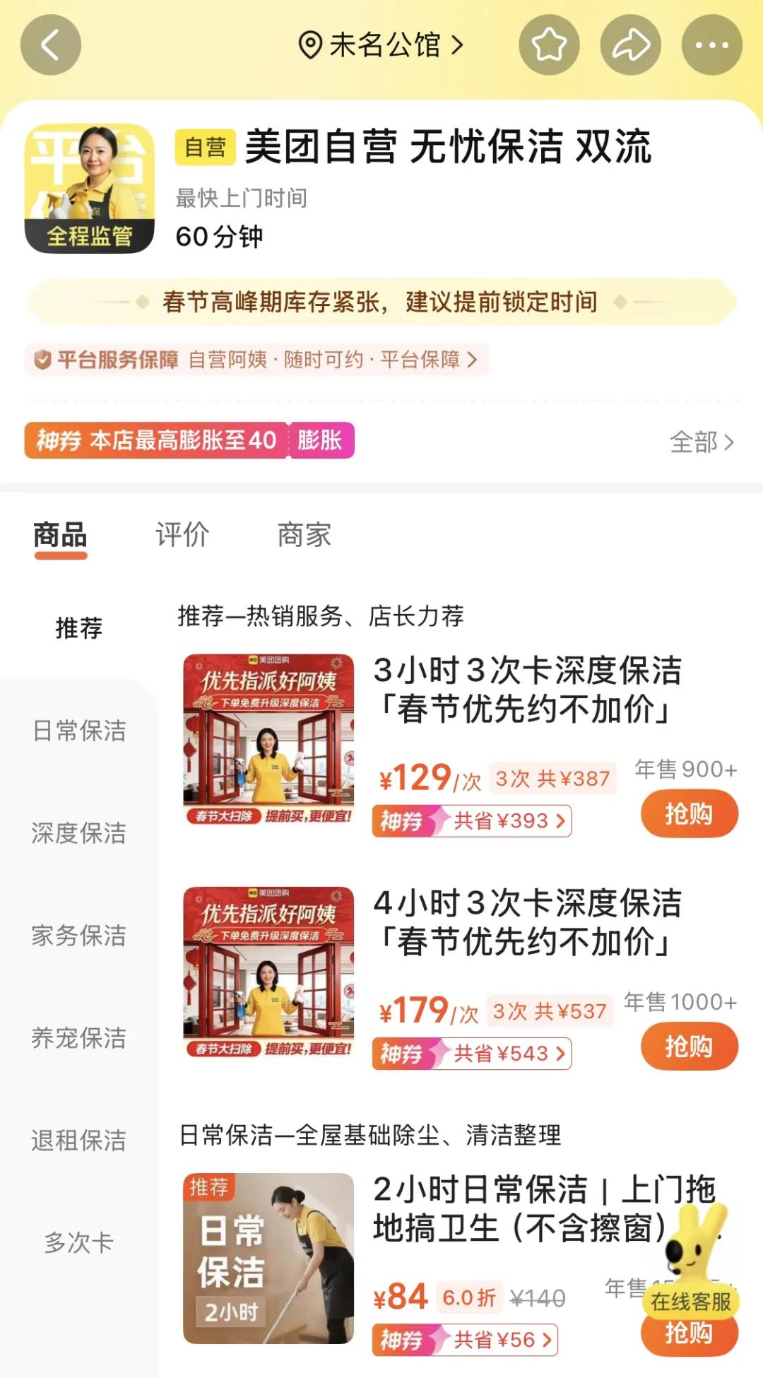 美团同样将家政纳入业务板块之中,不仅引入了家政服务供应商之外,2024年年底,美团还发展起自营的“美团无忧保洁”。据电商在线报道,当时美团短期内在杭州招募超过800名保洁员,并在商超、小区进行地推。