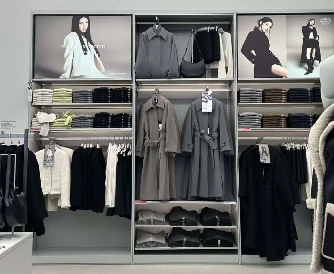 同样主打无logo基础款,优衣库的陈列更侧重功能性分类,设计更基础,而Musinsa则通过成套风格展示替代传统单品陈列,提升逛店效率,强调“韩女穿搭”的氛围感,简单却经得起多场景叠穿。