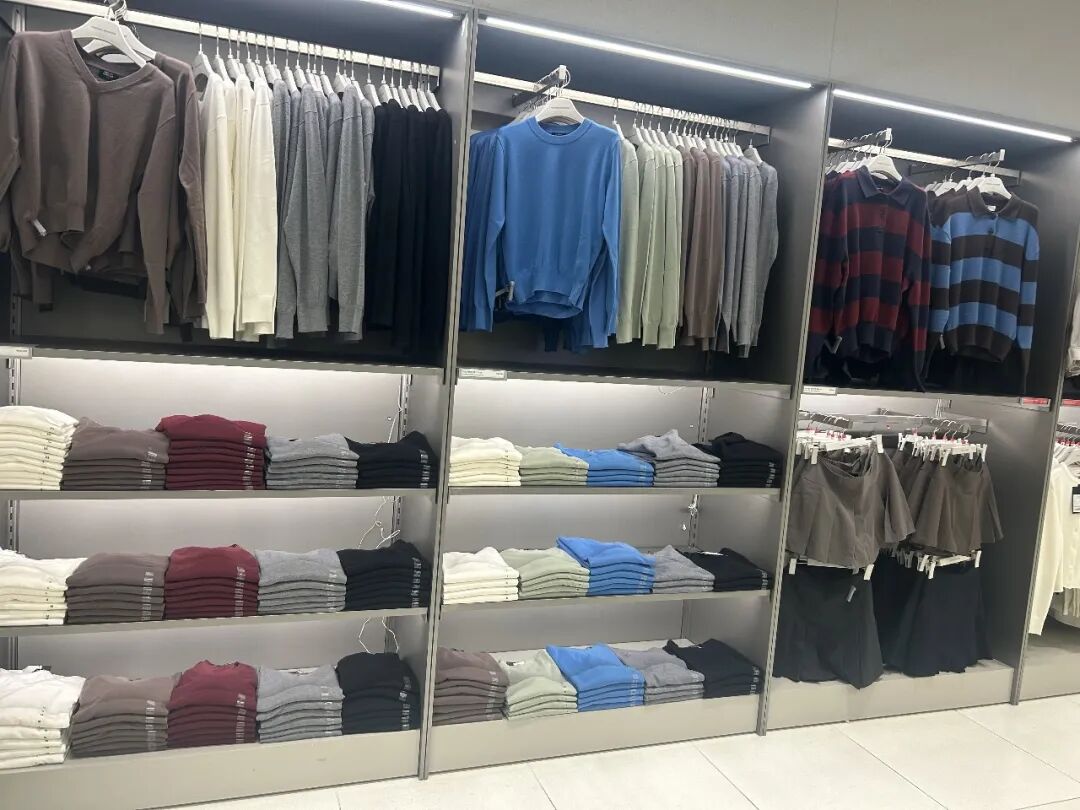 其次是商品陈列上,与传统快时尚密集堆叠的货架不同,Musinsa Standard门店以仓储式大店为特色,数千件单品在开阔空间里陈列,从保暖内衣到衬衫、费尔岛毛衣以及当下热门的排骨羽绒服,价格从80元到700元不等,有些商品定价略低于优衣库,部分商品还标注着“一日特价”,覆盖大众消费需求。