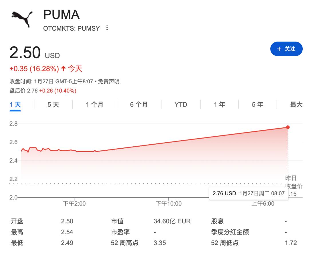 交易信息发布后,PUMA股价开盘后应声大涨。截至发稿前,股价上涨16.28%,市值近35亿欧元,安踏港股涨超2%。即便这笔交易传闻已久,投资者对信息消化了较长时间,但市场对这笔交易依然给予了正向反馈。