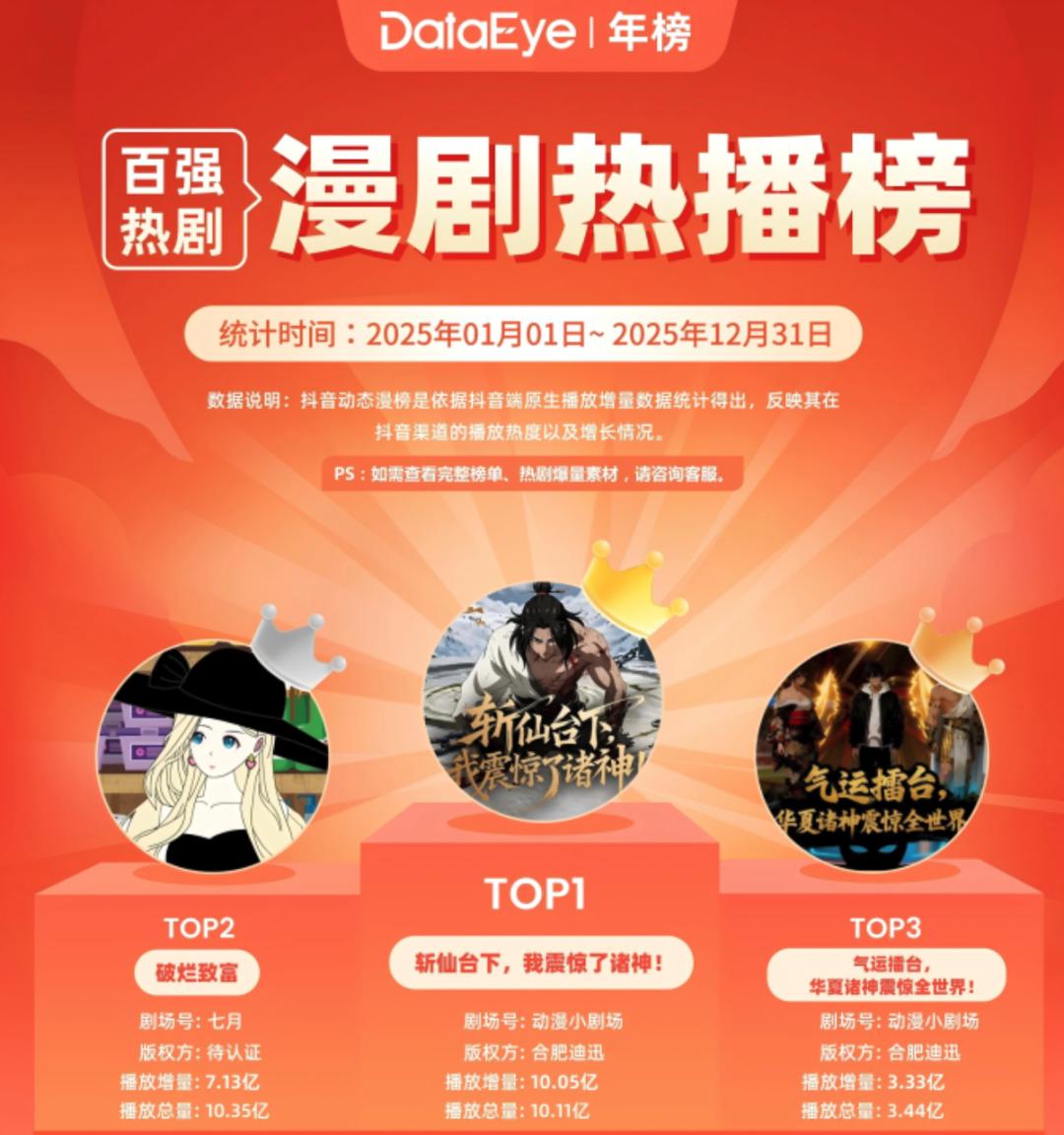 与增长数据一同爆炸的还有AI漫剧炸裂的播放量,据Dataeye统计,2025年抖音端原生年度TOP100漫剧总计播放增量达135.82亿,TOP100原生漫剧年度播放增量均超7000万,其中超过一半Ai漫剧的播放增量超过1亿。
