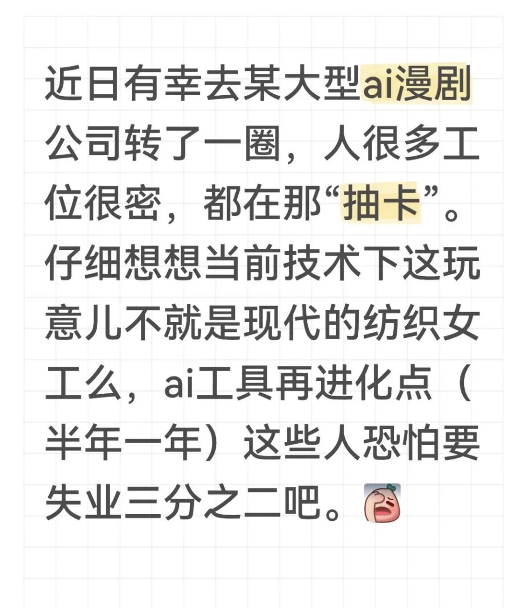 就跟传统动画制作需要高强度压榨画师那样,如今AI漫剧的逆天产能,其实还是建立在大量零门槛抽卡师基础上,从这个角度看,无论是传统动画还是AI漫剧本质上还是一场残酷的劳动力压榨游戏。