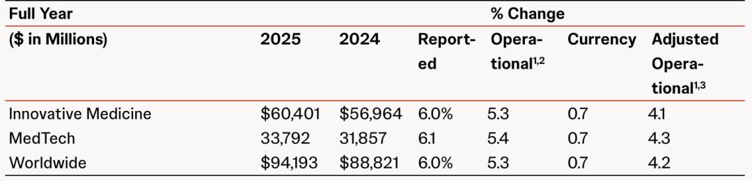 强生2025年全年营收941.93亿美元,同比增长6%, 其中: