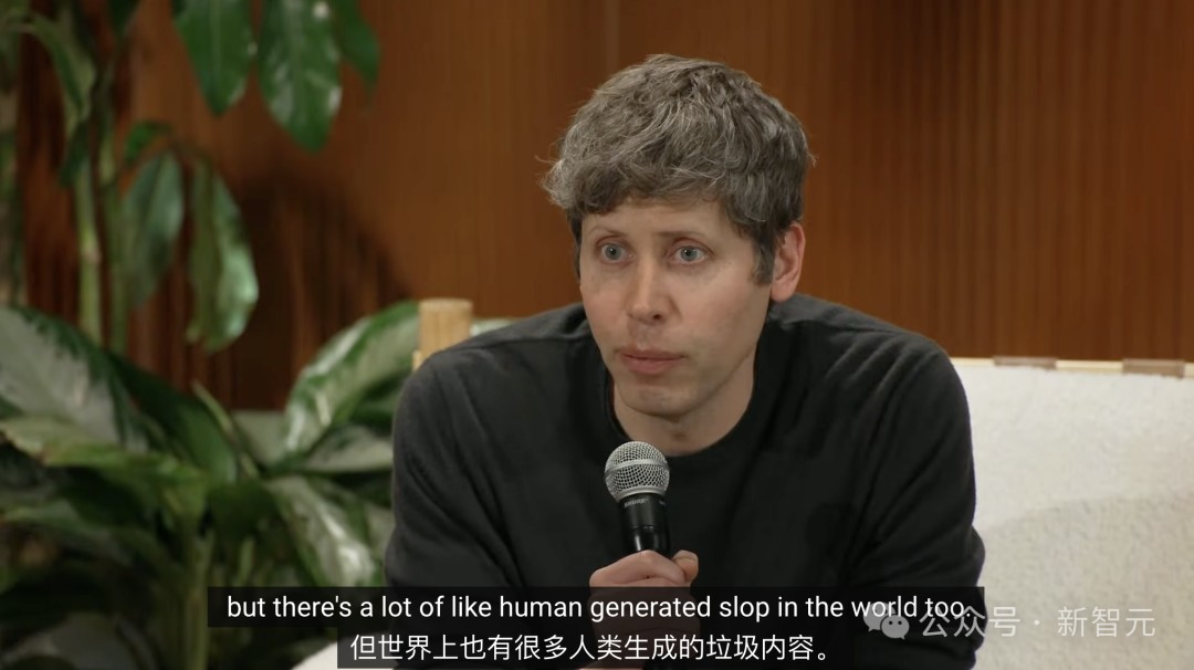 奥特曼回答道,现在的确流行叫AI生成的内容为「泔水」(Slop),但人类制造的垃圾也不少。