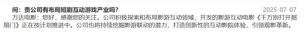 此外,2024年的世界人工智能大会上,慈文传媒发布了与互影科技联合开发的“AI+互动影游” 项目《仙剑纵横宇宙》;百纳千成也在投资者互动平台上表示,参与出品的《隐藏真探》进入内测及报批阶段; 儒意影业、万达电影也通过《千万别打开那扇门》等项目落子入局……