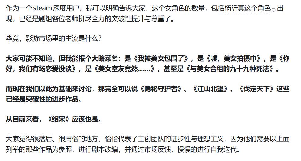 相似的,他指出,互动影游版《绍宋》对女性角色的改编无法完全脱离影游行业当前的创作“底子”。“影游改编是否成功,也是要在影游体系里做比较的。而影游的设定是否进步,也是要跟之前的影游做对比的。”