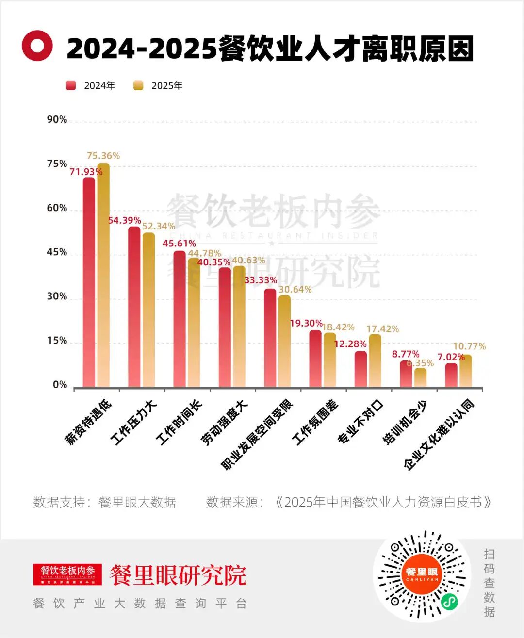 此外,让餐饮品牌头疼的还有人员的高流动性。据《2025年中国餐饮业人力资源白皮书》,2024年一线服务员年离职率高达89.47%,后厨一线人员75.44%,而高层管理人才仅3.5%。