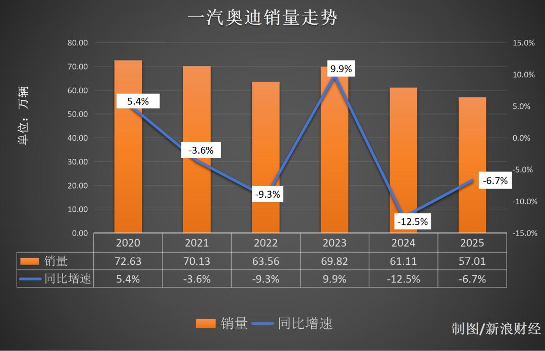 日前,一汽奥迪公布的数据显示,其全年中国市场销量达到零售57.01万辆,虽然官方宣称其燃油车销量及份额时隔六年重回燃油豪华车市场第一,但对比之下,相比2024年的61.11万辆,其销量同比下滑了6.7%。一汽奥迪的销量也出现连续两年同比下滑。