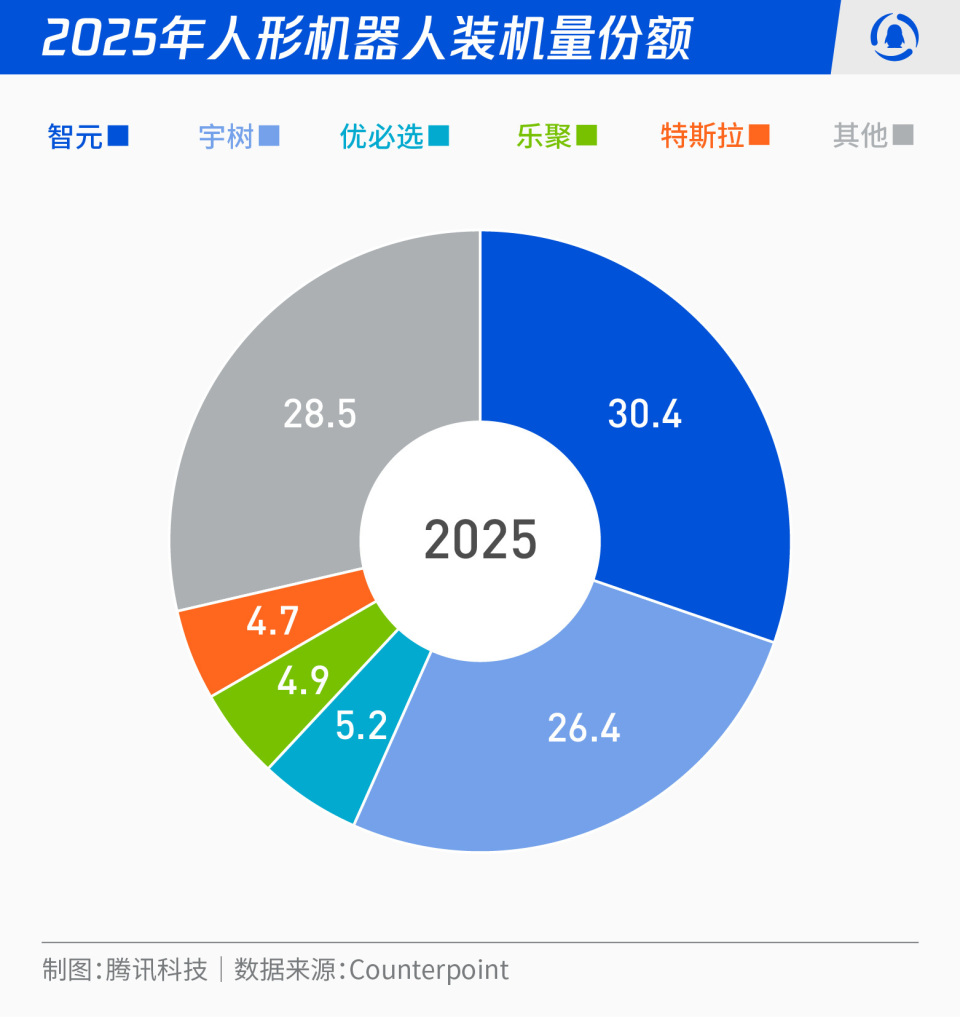 另外,市场机构Counterpoint日前披露的数据也显示,智元、宇树和优必选三家企业占据人形机器人市场份额前三名,分别为30.4%、26.4%、5.2%。