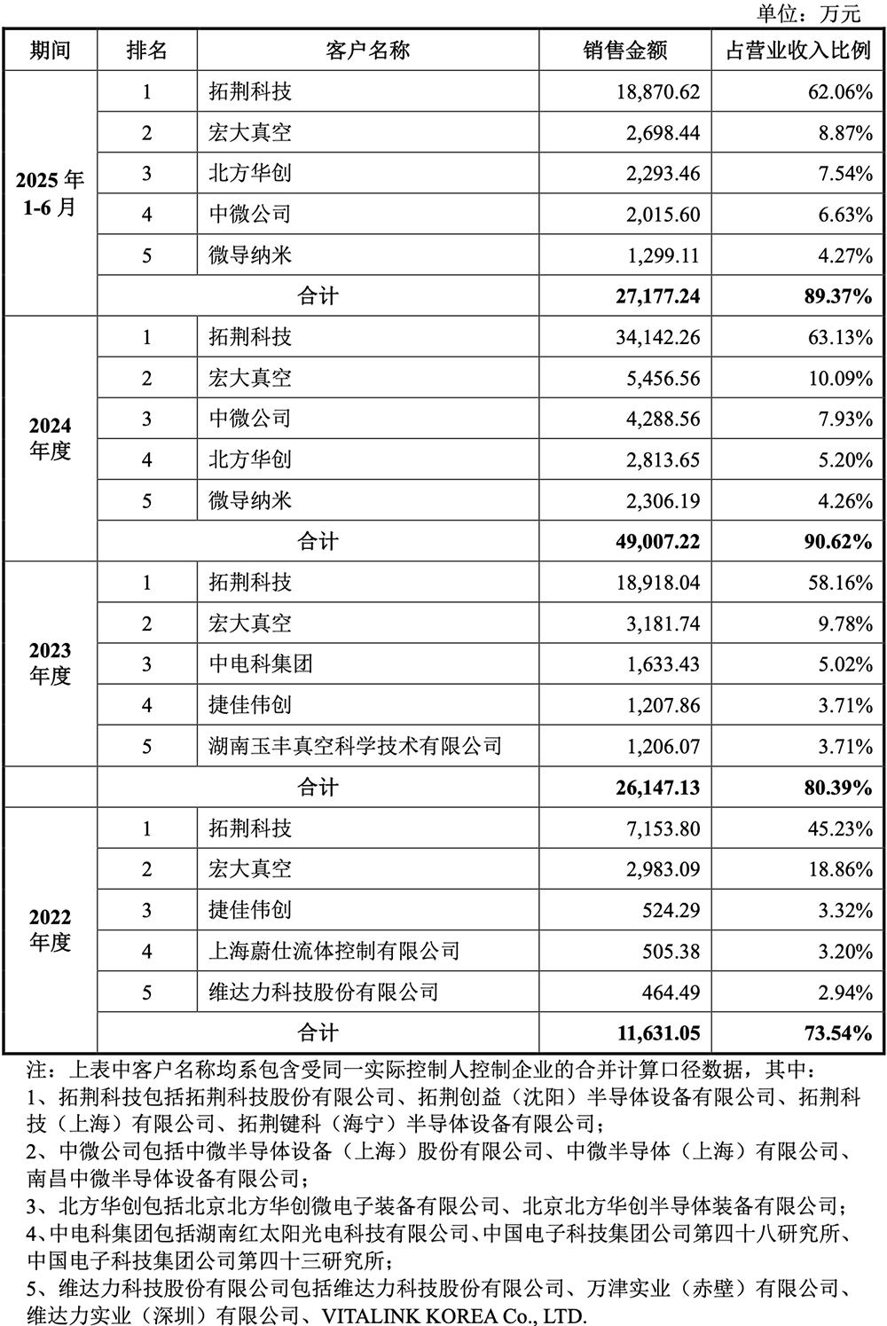 2022年、2023年、2024年、2025年1-6月,前五大客户产生的收入占恒运昌主营业务收入的比例分别为73.54%、80.39%、90.62%、89.37%,其中向第一大客户拓荆科技的销售收入占比分别为45.23%、58.16%、63.13%、62.06%,客户集中度较高。