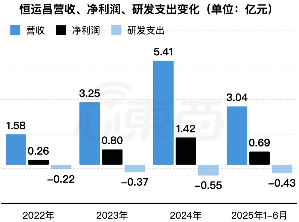 2022年、2023年、2024年、2025年1-6月,恒运昌营收分别为1.58亿元、3.25亿元、5.41亿元、3.04亿元,净利润分别为0.26亿元、0.80亿元、1.42亿元、0.69亿元,研发费用分别为0.22亿元、0.37亿元、0.55亿元、0.43亿元。