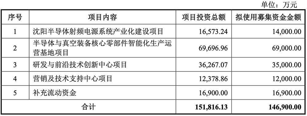 本次IPO,恒运昌募资总额为15.61亿元,募资净额为14.14亿元,拟用于沈阳半导体射频电源系统产业化建设等项目。