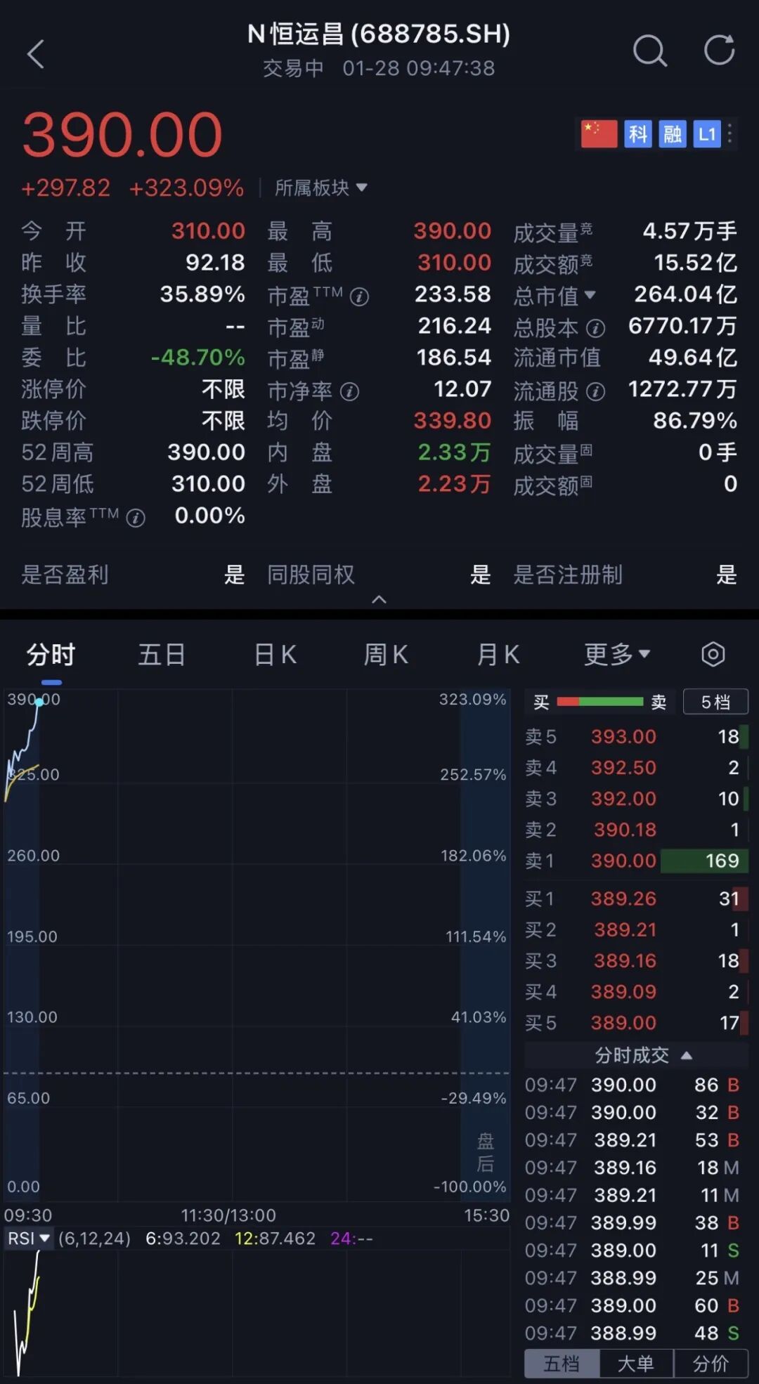 恒运昌发行价为92.18元/股,发行市盈率为48.39倍,开盘价为310元/股,涨幅达236%。截至9点50分,其股价最高上涨323%至390元/股,市值为264亿元。