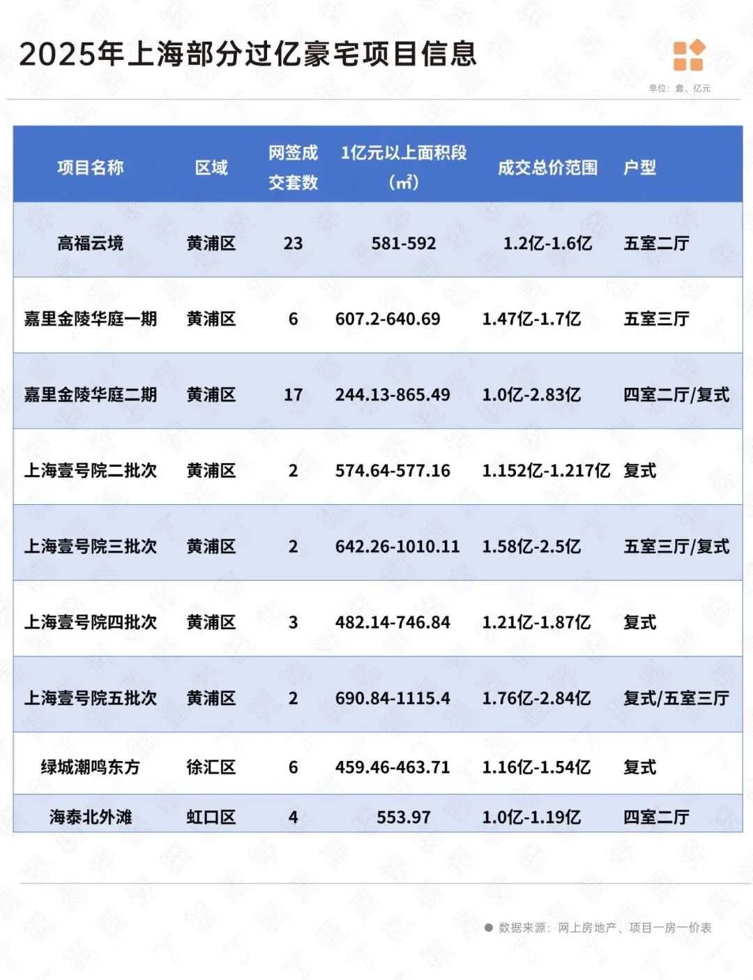 我们统计了2025年上海过亿豪宅网签成交情况,上半年上海壹号院、嘉里金陵华庭和绿城潮鸣东方三个项目就推出了16套过亿豪宅,其中绿城潮鸣东方6套总价超1亿元的顶复,最贵的一套接近1.54亿,开盘当天便一售而空。