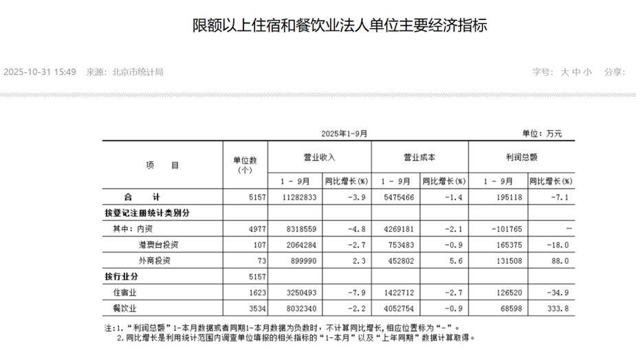 然而事实却并非如此。北京市统计局数据显示,2025年1-9月,北京1623家住宿企业总营业收入近325亿元,利润总额12.65亿元,同比增速分别为-7.9%和-34.9%。