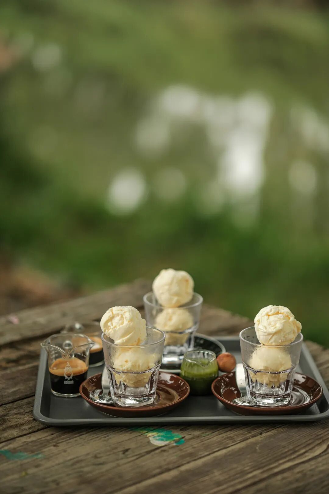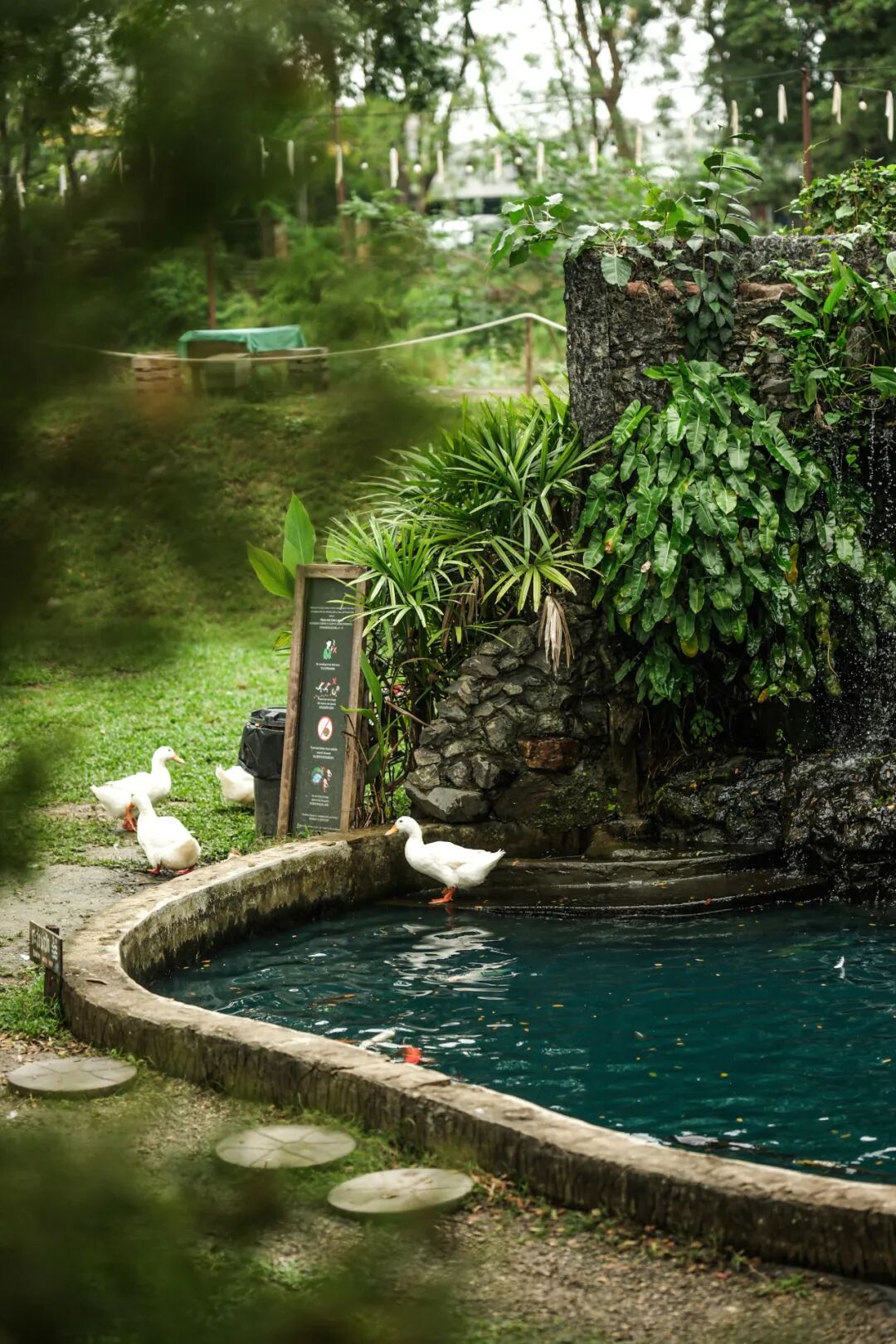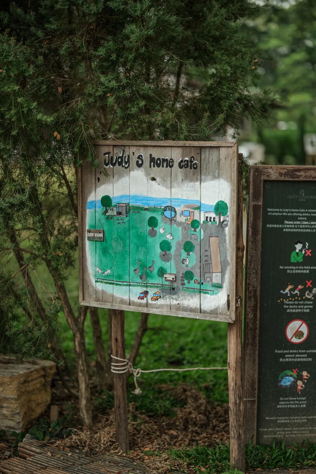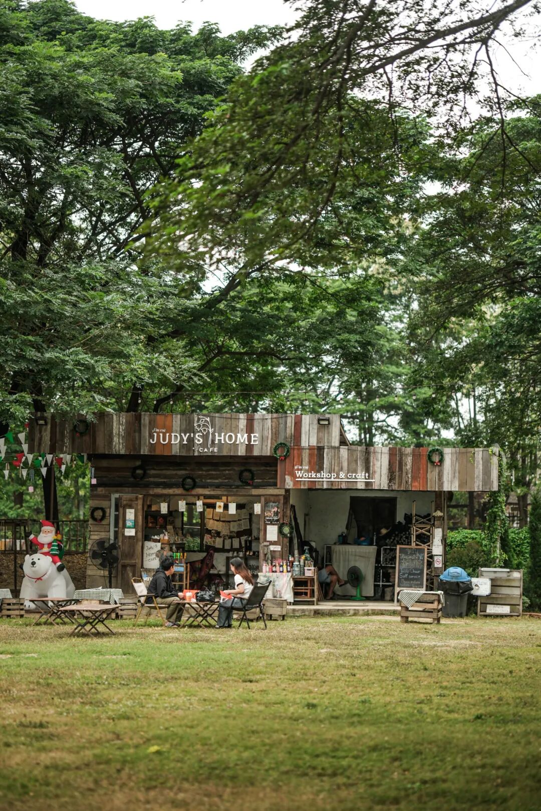 结束寺庙之行,已近午后,是该喝咖啡的时间。让司机带我们直奔 judy’s 咖啡馆。说是家庭咖啡馆,却占地数亩,开阔得令人惊喜。户外大草坪上鸡鸭鹅悠闲踱步,反正满地都能找到小虫当作食物,好不自在。草地尽头一栋白色主楼可以点单,进去点了几杯咖啡,去河边坐,店家说椅子可在绘画工坊隔壁自取。