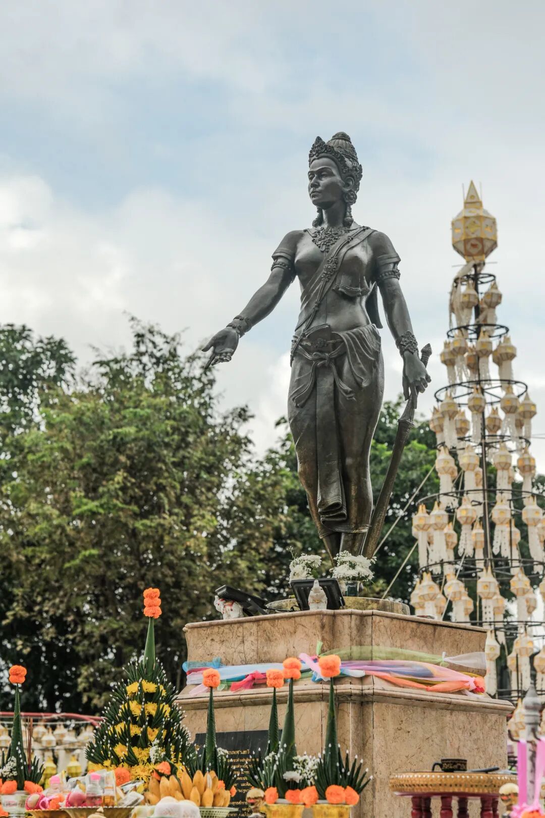 查玛德薇是哈里本猜的首位女王,引领当地建设繁荣,是一位非常重要的领袖。纪念碑气势宏伟,女王左手持剑,象征力量与勇气。有不少泰国民众在纪念碑下跪拜祭祀,尽显虔诚。他们相信这样做会获得智慧与勇气。
